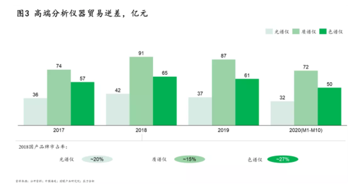 其一,自動監(jiān)測對儀器設(shè)備提出了更高的要求,外資企業(yè)重獲競爭力。當(dāng)前我國分析儀器仍依賴進(jìn)口,近兩年來貿(mào)易逆差雖有所降低,但依然存在數(shù)十億的差距(如圖3)。2018年,光譜儀、質(zhì)譜儀、色譜儀的國產(chǎn)品牌市占率約為20%、15%、27%,差距仍然較大。