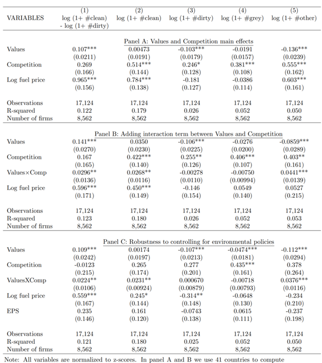 第一,本文構(gòu)建了一個(gè)簡(jiǎn)單的模型,并收集了企業(yè)級(jí)汽車行業(yè)、國民環(huán)境態(tài)度(綠色偏好)和市場(chǎng)競(jìng)爭(zhēng)程度的數(shù)據(jù)。我們發(fā)現(xiàn):綠色偏好及其與市場(chǎng)競(jìng)爭(zhēng)的相互作用都對(duì)企業(yè)重視綠色創(chuàng)新的機(jī)率有顯著的積極影響。