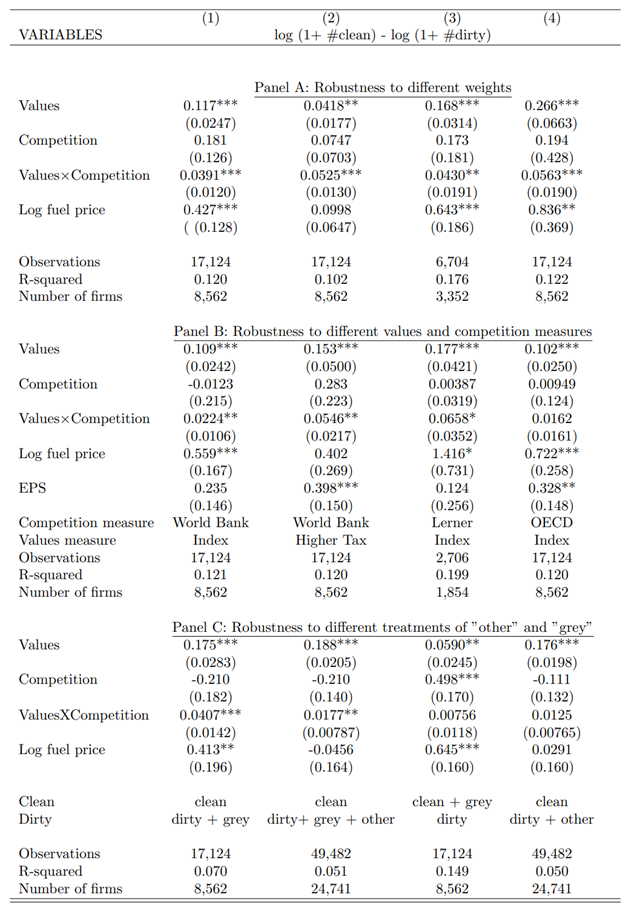 (2)作為穩(wěn)健性檢驗(yàn),企業(yè)綠色偏好指標(biāo)是由41國家的環(huán)境保護(hù)意愿指數(shù)加權(quán),本文調(diào)整了權(quán)重的多種計(jì)算方式并進(jìn)行回歸實(shí)證,結(jié)果仍然顯示綠色偏好對(duì)綠色創(chuàng)新活動(dòng)有顯著的促進(jìn)作用。綠色偏好與市場(chǎng)競(jìng)爭(zhēng)程度對(duì)綠色創(chuàng)新的交互影響也大體為正向。市場(chǎng)競(jìng)爭(zhēng)程度本身對(duì)非綠色轉(zhuǎn)向綠色創(chuàng)新研發(fā)的程度不顯著。