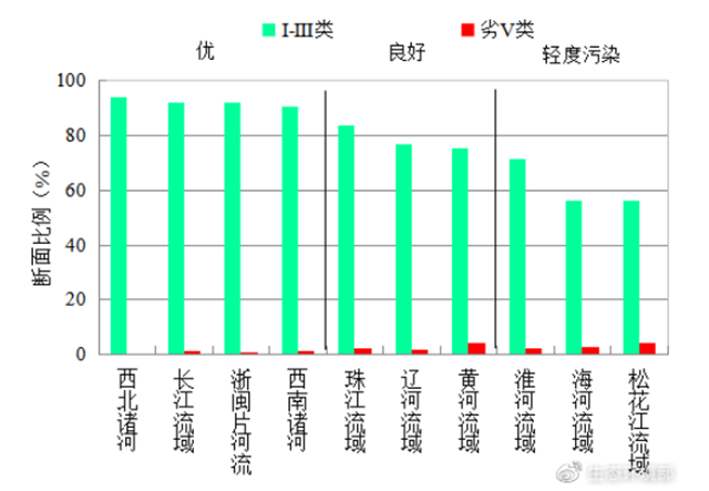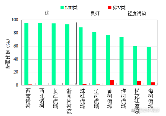 1-4月,長江、黃河、珠江、松花江、淮河、海河、遼河等七大流域及西北諸河、西南諸河和浙閩片河流水質優(yōu)良(Ⅰ——Ⅲ類)斷面比例為83.8%,同比上升1.5個百分點;劣Ⅴ類斷面比例為2.1%,同比下降1.1個百分點。主要污染指標為化學需氧量、高錳酸鹽指數和五日生化需氧量。其中,西南諸河、西北諸河、長江流域和浙閩片河流水質為優(yōu),珠江、遼河和黃河流域水質良好,淮河、松花江和海河流域為輕度污染。