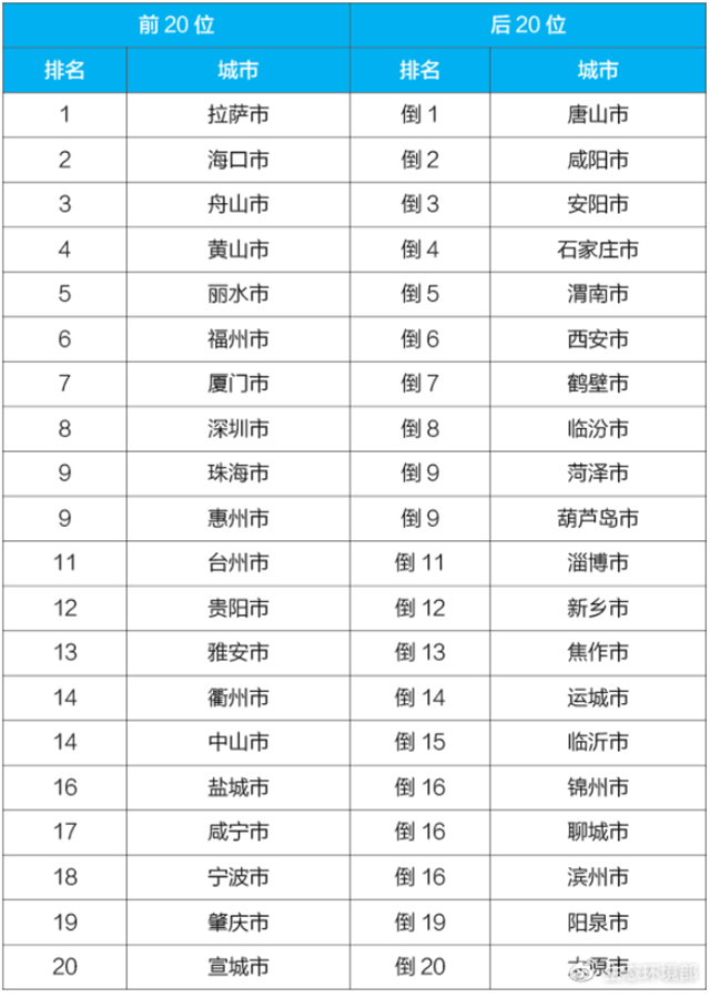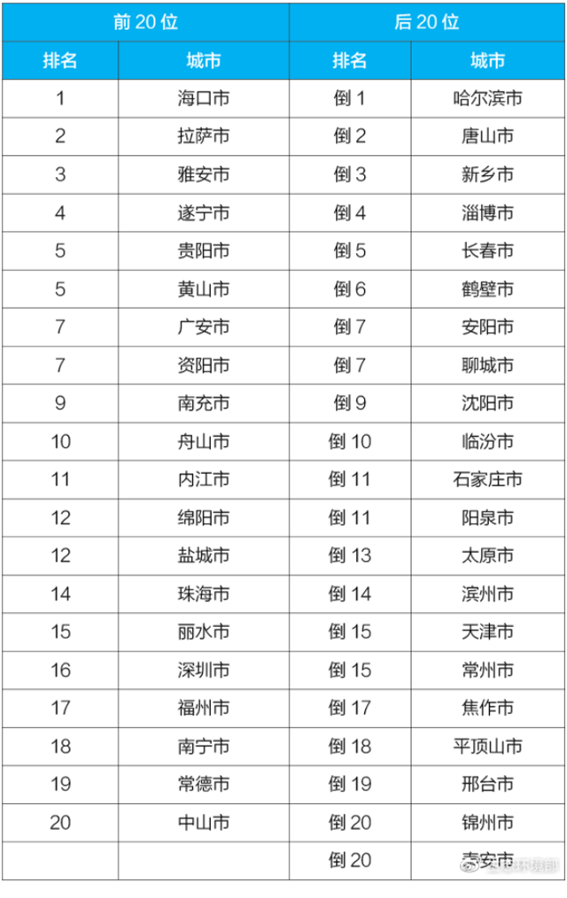 4月,168個重點城市中,哈爾濱、唐山和新鄉(xiāng)市等城市空氣質量相對較差(從倒數第1名至并列倒數第20名);海口、拉薩和雅安市等城市空氣質量相對較好(從第1名至第20名),見附表3。