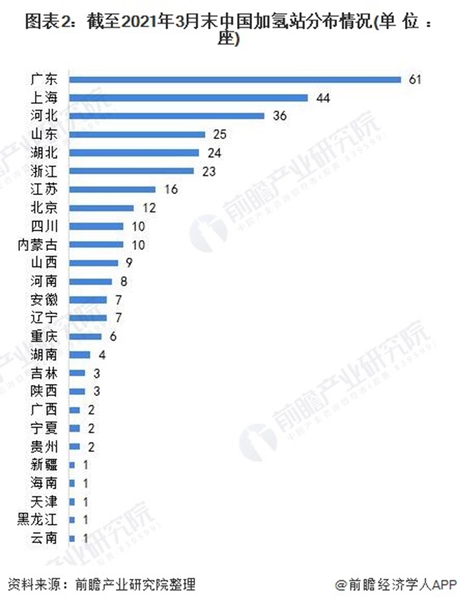 從區(qū)域分布上來看,我國加氫站主要集中在東部沿海等燃料電池汽車產(chǎn)業(yè)發(fā)展較為領(lǐng)先的省市,如廣東、上海等。其中,廣東省已運(yùn)營、已建成、在建及擬建的加氫站共61座,排名全國第一;上海44座,排名第二。