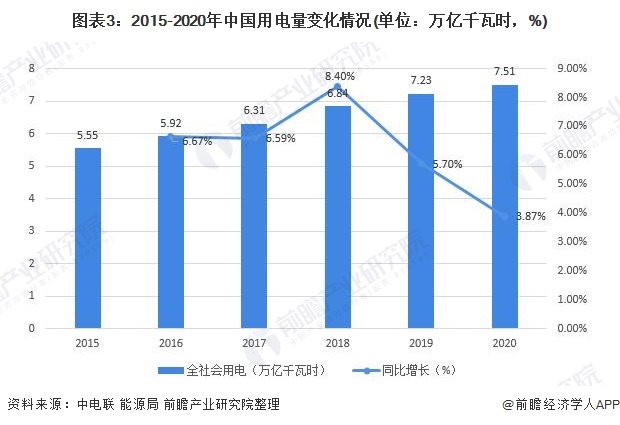 從我國(guó)的用電規(guī)模來(lái)看,2015-2020年,全社會(huì)用電量逐年增長(zhǎng)。2020年,全社會(huì)用電量7.51萬(wàn)億千瓦時(shí),同比增長(zhǎng)3.95%,全國(guó)電力供需形勢(shì)總體平衡。隨著疫情得到有效控制以及國(guó)家逆周期調(diào)控政策逐步落地,復(fù)工復(fù)產(chǎn)、復(fù)商復(fù)市持續(xù)取得明顯成效,社會(huì)用電穩(wěn)定恢復(fù)。