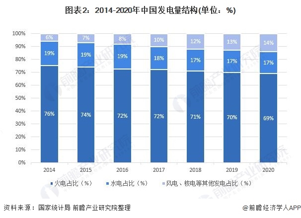 此外,雖然近年來(lái)我國(guó)將重點(diǎn)發(fā)展核電、新能源發(fā)電,但目前火力發(fā)電規(guī)模依然占比非常大。2020年我國(guó)發(fā)電結(jié)構(gòu)中,有69%的發(fā)電量來(lái)自于火電,但是2014-2020年的發(fā)電量結(jié)構(gòu)變化能夠看出我國(guó)火電發(fā)電占比是處于逐漸下降的,風(fēng)電、光伏、核能等其他能源發(fā)電占比逐漸升高。