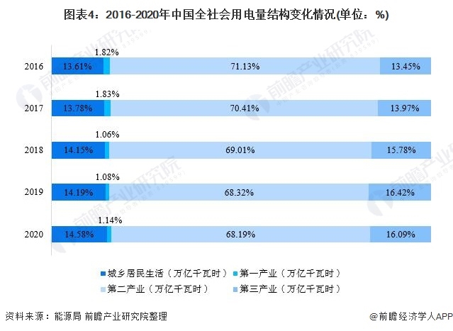 2020年,全國(guó)第一產(chǎn)業(yè)用電量859億千瓦時(shí),占比1.14%;第二產(chǎn)業(yè)用電量5.12萬(wàn)億千瓦時(shí),占比68.19%;第三產(chǎn)業(yè)用電量1.21萬(wàn)億千瓦時(shí),占比16.09%;城鄉(xiāng)居民生活用電量1.09萬(wàn)億千瓦時(shí),占比14.58%。