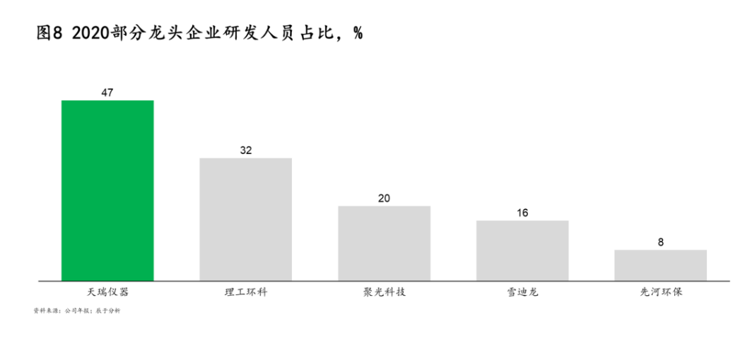 四是重視技術(shù)人才培養(yǎng)。企業(yè)應(yīng)持續(xù)吸引培養(yǎng)足夠數(shù)量的研發(fā)人員,持續(xù)優(yōu)化技術(shù)研究管理制度、激勵獎懲制度等,提高科研成果轉(zhuǎn)化率。如天瑞儀器研發(fā)人員占員工比重在40%-50%之間(如圖8)。