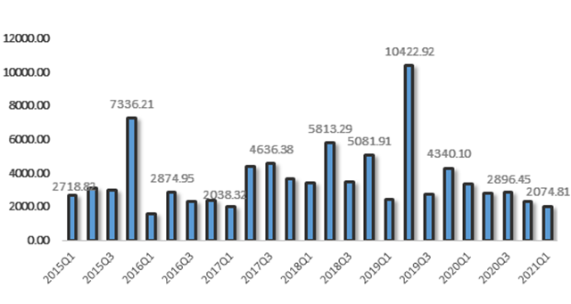 2021年第一季度,浙江省排污權(quán)成交量較上季度有所減少。四項(xiàng)排污權(quán)成交量合計(jì)為2074.81噸,環(huán)比下跌11.41%,同比下降39.08%。