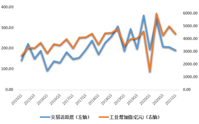 從工業(yè)經(jīng)濟(jì)指標(biāo)來看,浙江省排污權(quán)交易活躍度與工業(yè)增加值(采用浙江省地區(qū)工業(yè)增加值各季度增加值,非累計(jì))第一季度整體也呈正相關(guān)走勢(shì)顯著性水平小于0.05,皮爾遜相關(guān)系數(shù)為0.633。