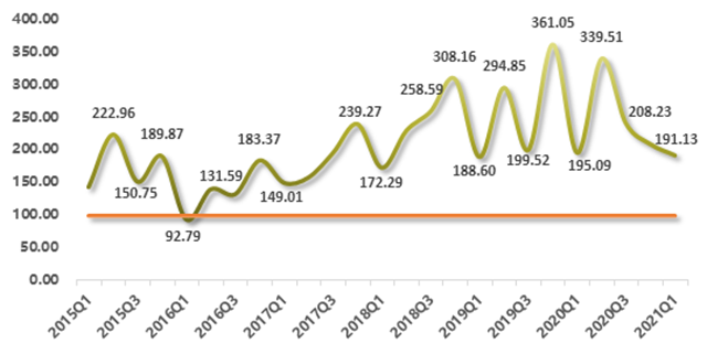 浙江省排污權(quán)交易活躍度波動(dòng)運(yùn)行,2021年第一季度浙江省排污權(quán)交易活躍度收?qǐng)?bào)于191.13點(diǎn),環(huán)比下跌8.21%,同比下降2.03%。