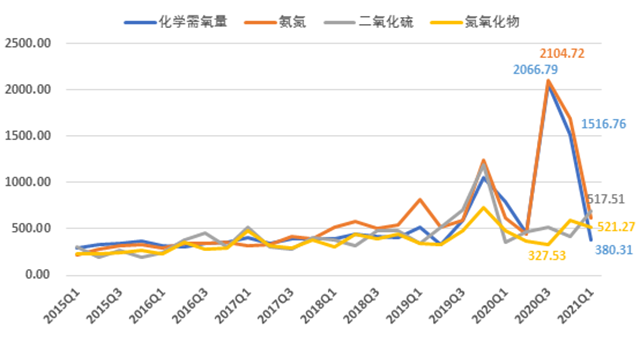 從四項(xiàng)排污權(quán)環(huán)比情況來看,化學(xué)需氧量、氨氮、氮氧化物環(huán)比分別下跌74.93%、63.72%、12.48%,二氧化硫環(huán)比上漲66.63%;從同比情況來看,化學(xué)需氧量、氨氮環(huán)比同比分別下降52.27%、0.40%,二氧化硫、氮氧化物同比分別上升96.88%、7.99%。
