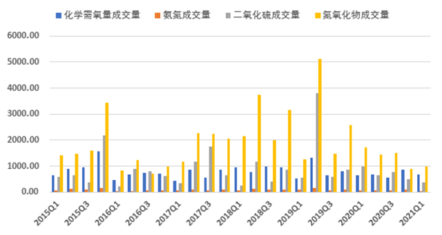 從四項(xiàng)排污權(quán)成交量環(huán)比情況來看,化學(xué)需氧量、氨氮、二氧化硫成交量分別下跌19.81%、47.32%、28.90%,氮氧化物成交量上漲10.23%;從同比情況來看,化學(xué)需氧量成交量上升7.00%,氨氮、二氧化硫、氮氧化物成交量分別下降29.92%、62.52%、43.26%。