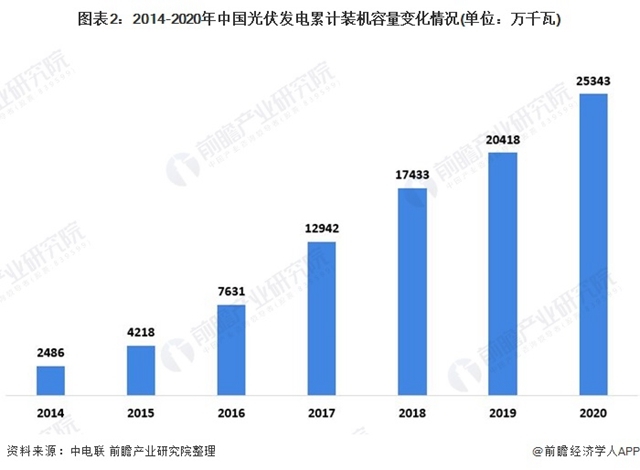 截至2020年底,我國太陽能發(fā)電累計裝機(jī)容量達(dá)25343萬千瓦,較2019年增加了4925萬千瓦,同比增長24.1%。
