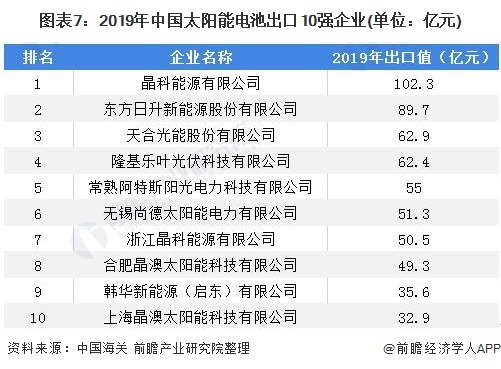 根據(jù)《中國海關(guān)》雜志2020年4月刊公布數(shù)據(jù)顯示,多家光伏企業(yè)躋身2019年出口前200強(qiáng)。其中晶科能源有限公司以102.3億元的出口值排名太陽能電池出口企業(yè)第一名;東方日升能源股份有限公司排名第二,出口值為89.7億元;天合光能股份有限公司排名第三,出口值為62.9億元。