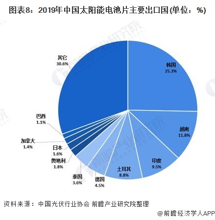 從出口國分布來看,2019年我國電池片出口國出口額排名第一的是韓國,占比為25.3%;越南排名第二,占比為11.8%;印度排名第三,占比為9.5%。2019年前十大出口國合計占比69.4%,比2018年同期的51.2%大幅提高18.2個百分點,海外產(chǎn)能進(jìn)一步集中。