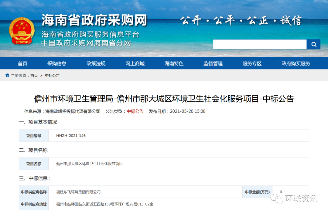 5月20日,儋州市環(huán)境衛(wèi)生管理局儋州市那大城區(qū)環(huán)境衛(wèi)生社會化服務項目開標結果出爐,中標供應商為碧桂園生活服務集團股份有限公司控股企業(yè)福建東飛環(huán)境集團有限公司,成交金額約3.5億元/3年。