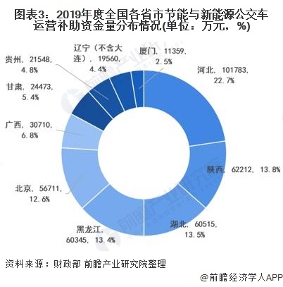 從各省/市2019年度節(jié)能與新能源公交車運(yùn)營補(bǔ)助資金量情況來看,全國共有10個(gè)省/市得到補(bǔ)助資金,其中河北省的補(bǔ)助資金規(guī)模最大,約10.2億元,占比22.7%;其次是陜西省約6.22億元,占比13.8%;排名第三的是湖北省約6.05億元,占比13.5%。