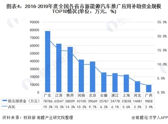從各省市新能源汽車推廣應(yīng)用補(bǔ)助情況來看,全國共有21個(gè)省/直轄市得到補(bǔ)助資金,其中廣東省的補(bǔ)助資金規(guī)模最大,達(dá)到78786萬元,占比19.3%;其次是江蘇省為62547萬元,占比15.3%;排名第三的是陜西為58509萬元,占比10.3%。
