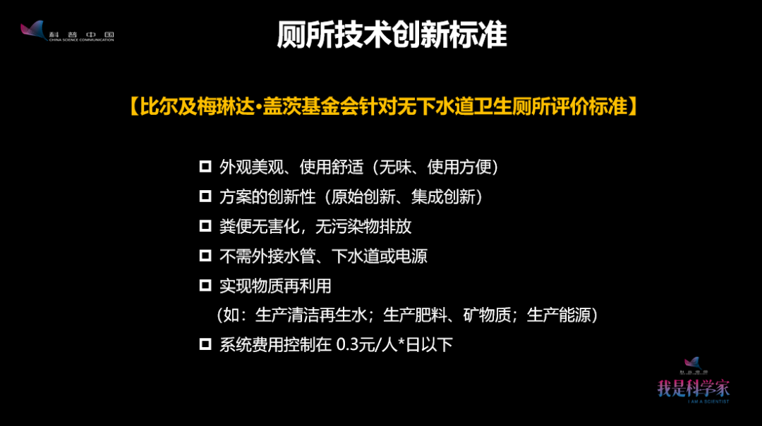 這是蓋茨基金會(huì)針對(duì)新型廁所提出的,從舒適度上、衛(wèi)生安全、資源化、經(jīng)濟(jì)上面提出了一系列的要求。你要?jiǎng)?chuàng)新,但需要滿(mǎn)足這些要求才能夠獲得基金會(huì)的支持。