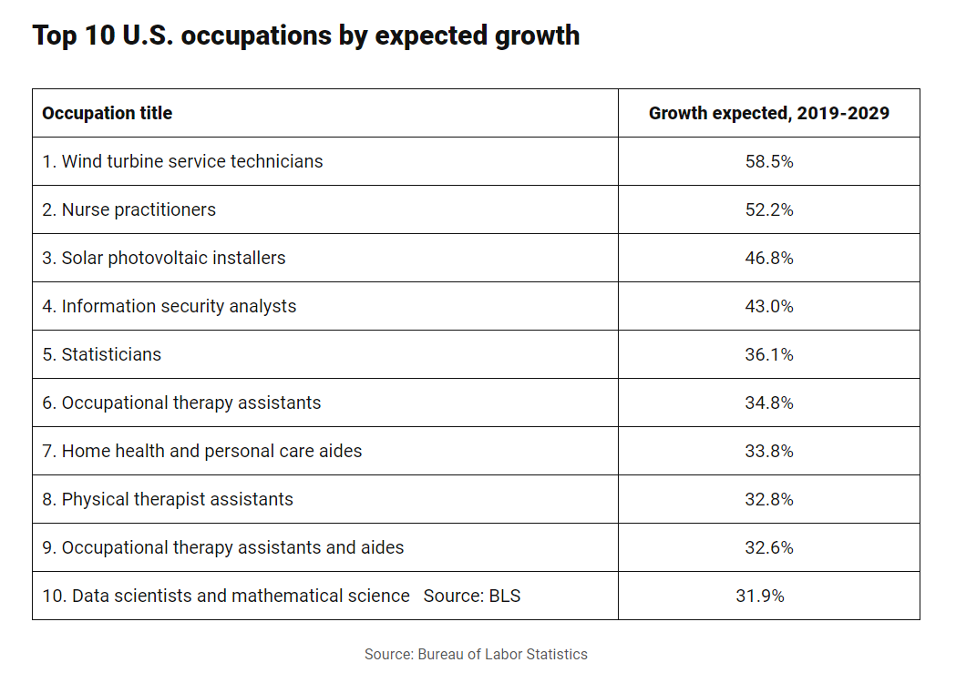 按預(yù)期增長分列的美國前10大職業(yè)(2019-2029年預(yù)期崗位增長率):