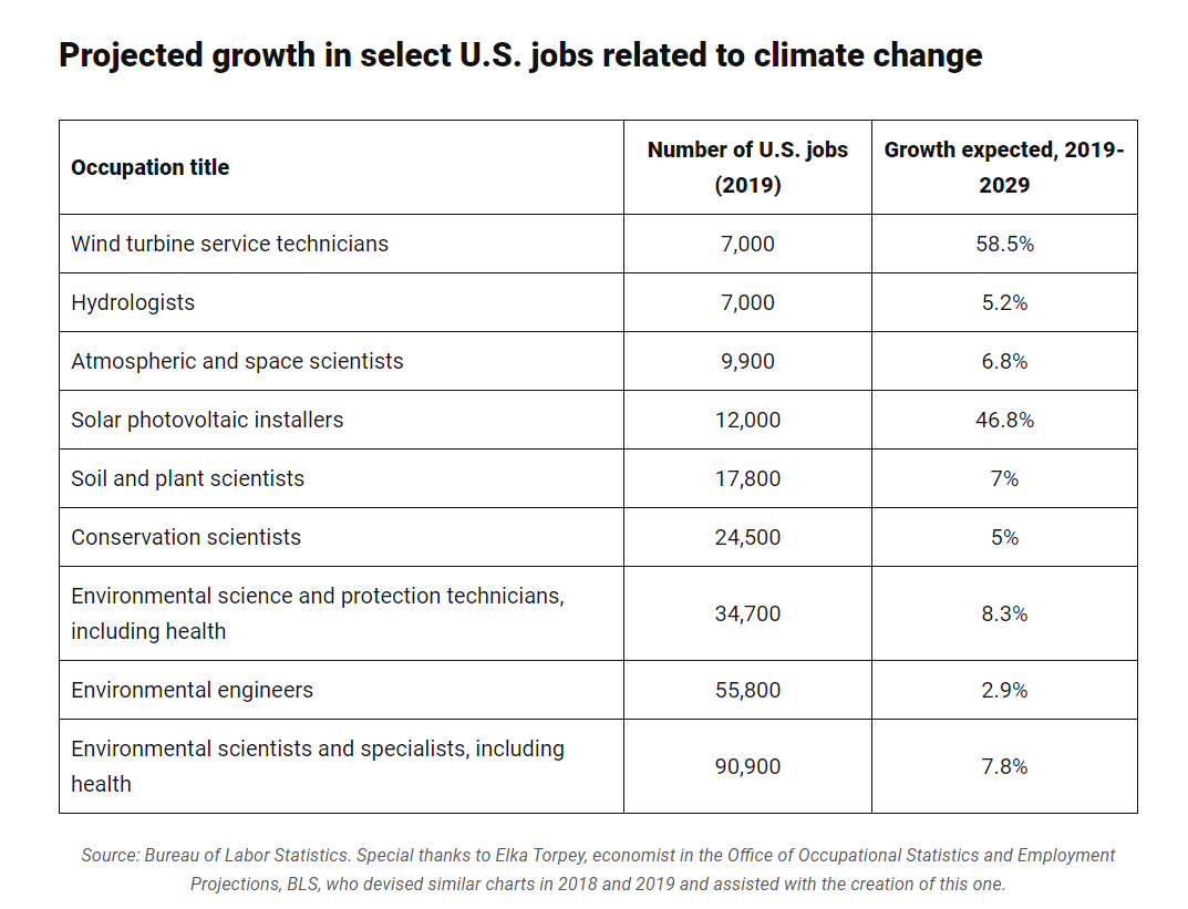 據(jù)美國勞工統(tǒng)計局的數(shù)據(jù),預(yù)計2029年前,一系列與氣候有關(guān)的職業(yè)將快速增長: