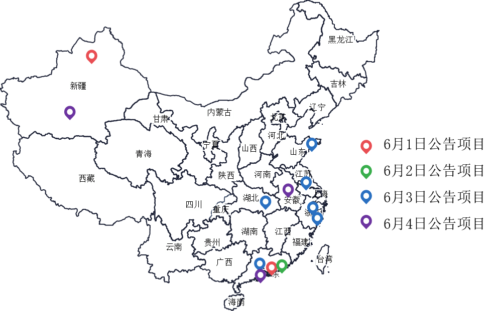 6月份1日到4日監(jiān)測(cè)到的12個(gè)“城市管家項(xiàng)目”分布于廣東、湖北、江蘇、山東、新疆、浙江、安徽七省區(qū)。其中,區(qū)縣級(jí)“城市管家項(xiàng)目”5個(gè), 鎮(zhèn)街級(jí)“城市管家項(xiàng)目”7個(gè)。