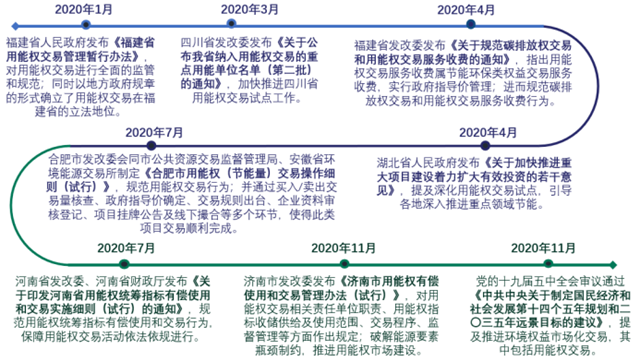 2020年用能權(quán)交易市場(chǎng)建設(shè)總體快于節(jié)能量交易市場(chǎng),多個(gè)中央與省級(jí)政策文件出臺(tái),進(jìn)一步推動(dòng)用能權(quán)交易市場(chǎng)發(fā)展。