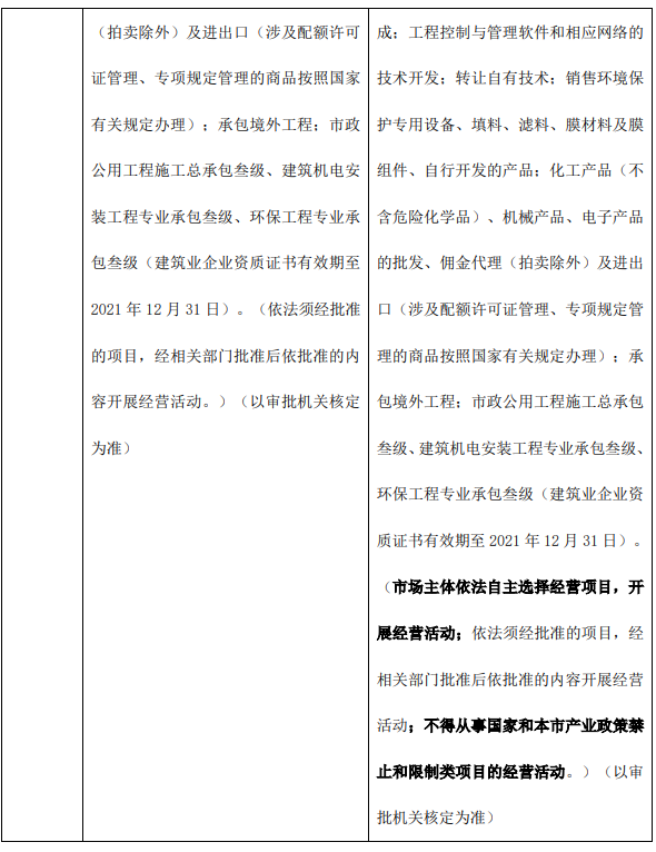 變更后公司經(jīng)營(yíng)范圍為:環(huán)境保護(hù)設(shè)施運(yùn)營(yíng);環(huán)境保護(hù)技術(shù)、水處理及污水處理技術(shù)、苦咸水及海水淡化技術(shù)、水及水中價(jià)值物再生回用和資源化技術(shù)、環(huán)保節(jié)能技術(shù)、生態(tài)修復(fù)技術(shù)、物聯(lián)網(wǎng)、大數(shù)據(jù)、云計(jì)算的技術(shù)開發(fā)、技術(shù)推廣、技術(shù)轉(zhuǎn)讓、技術(shù)咨詢、技術(shù)服務(wù);信息系統(tǒng)集成服務(wù);通訊設(shè)備銷售;計(jì)算機(jī)、軟件及輔助設(shè)備批發(fā);地理遙感信息服務(wù);軟件銷售;技術(shù)推廣服務(wù);基礎(chǔ)軟件服務(wù),應(yīng)用軟件服務(wù)(不含醫(yī)用軟件)、軟件開發(fā);機(jī)電設(shè)備安裝;工程工藝設(shè)計(jì);建設(shè)工程項(xiàng)目管理;計(jì)算機(jī)系統(tǒng)集成;工程控制與管理軟件和相應(yīng)網(wǎng)絡(luò)的技術(shù)開發(fā);轉(zhuǎn)讓自有技術(shù);銷售環(huán)境保護(hù)專用設(shè)備、填料、濾料、膜材料及膜組件、自行開發(fā)的產(chǎn)品;化工產(chǎn)品(不含危險(xiǎn)化學(xué)品)、機(jī)械產(chǎn)品、電子產(chǎn)品的批發(fā)、傭金代理(拍賣除外)及進(jìn)出口(涉及配額許可證管理、專項(xiàng)規(guī)定管理的商品按照國(guó)家有關(guān)規(guī)定辦理);承包境外工程;市政公用工程施工總承包叁級(jí)、建筑機(jī)電安裝工程專業(yè)承包叁級(jí)、環(huán)保工程專業(yè)承包叁級(jí)(建筑業(yè)企業(yè)資質(zhì)證書有效期至 2021 年 12 月 31 日)。(市場(chǎng)主體依法自主選擇經(jīng)營(yíng)項(xiàng)目,開展經(jīng)營(yíng)活動(dòng);依法須經(jīng)批準(zhǔn)的項(xiàng)目,經(jīng)相關(guān)部門批準(zhǔn)后依批準(zhǔn)的內(nèi)容開展經(jīng)營(yíng)活動(dòng);不得從事國(guó)家和本市產(chǎn)業(yè)政策禁止和限制類項(xiàng)目的經(jīng)營(yíng)活動(dòng)。)