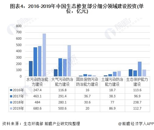 從生態(tài)修復(fù)細(xì)分領(lǐng)域建設(shè)投資情況來看,投入最多的為水污染防治建設(shè)和大氣污染防治建設(shè)兩個(gè)板塊,2019年這兩個(gè)部分投入建設(shè)資金分別為680.6億元和500.6億元;固廢污染防治、土壤污染防治和生態(tài)保護(hù)的建設(shè)資金則相對(duì)較少,2019年分別為20億元、86.9億元和112.7億元。