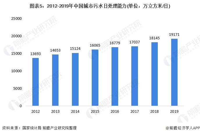 隨著國(guó)家政策的持續(xù)發(fā)力、水務(wù)投資的持續(xù)加碼,我國(guó)城市污水日處理能力逐步加強(qiáng),從2012年的13693萬(wàn)立方米/日穩(wěn)步增長(zhǎng)至2019年的19171萬(wàn)立方米/日。