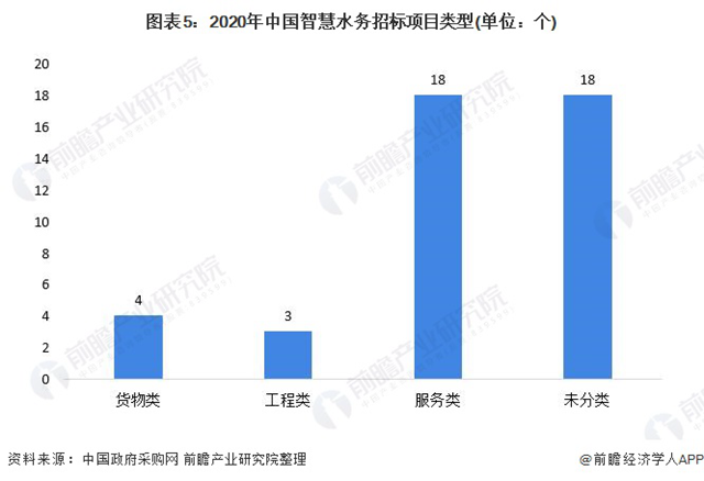 從項目類型來看,我國智慧水務(wù)項目采購內(nèi)容包括貨物類、工程類和服務(wù)類。2020年,我國智慧水務(wù)招標(biāo)項目中貨物類項目4個,工程類項目3個,服務(wù)類項18個,未分類項目18個。