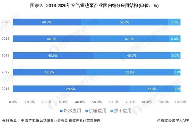 氣源熱泵應(yīng)用領(lǐng)域包括熱水市場(chǎng)、供暖市場(chǎng)、工農(nóng)業(yè)烘干市場(chǎng)三個(gè)主要市場(chǎng),其中熱泵熱水市場(chǎng)和熱泵采暖市場(chǎng)占了市場(chǎng)的絕大部分且競(jìng)爭(zhēng)激烈,所占比例之和連續(xù)三年超過(guò)90%。