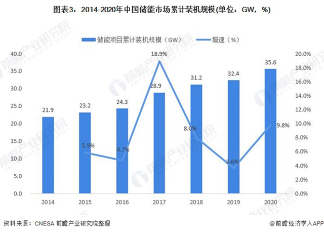 由于儲能在清潔利用方面的重要作用,近年來,我國儲能項目裝機規(guī)模穩(wěn)步增長。根據(jù)中關村儲能產(chǎn)業(yè)技術聯(lián)盟(CNESA)統(tǒng)計,截至2020年底,我國已投運儲能項目累計裝機規(guī)模為35.6GW,占全球市場總規(guī)模的18.6%,同比增長9.8%。