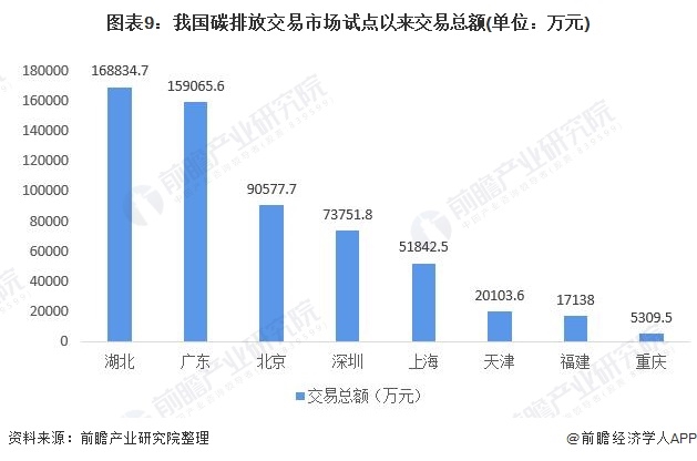 根據(jù)中國(guó)碳排放交易網(wǎng)公布的數(shù)據(jù)來(lái)看從2013年各地試點(diǎn)以來(lái),湖北省的碳排放權(quán)交易總額為七個(gè)地區(qū)之中最高為16.88億元。