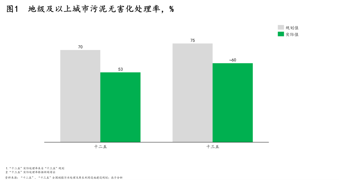 在此背景下,各級政府最終選擇先將污泥處理放一放,將有限資金優(yōu)先用于污水處理設(shè)施和管網(wǎng)建設(shè),這導(dǎo)致國內(nèi)“重水輕泥”的傾向明顯,“十二五”和“十三五”規(guī)劃中的地級及以上城市污泥無害化處理率目標(biāo)兩次落空也就見怪不怪了(見圖1)。