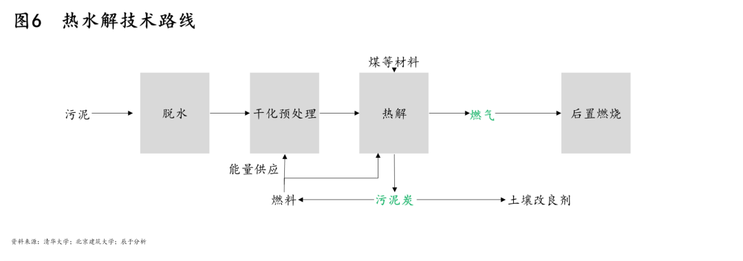 而在資源回收上,相比好氧堆肥,干化焚燒及熱水解則是更好的資源化方式,值得重點(diǎn)關(guān)注。干化焚燒的技術(shù)路線如圖5所示,作為最快捷、最徹底實(shí)現(xiàn)污泥減量化、穩(wěn)定化、無害化的最終處置技術(shù),干化焚燒后的資源化利用產(chǎn)品也更易走通;熱水解的技術(shù)路線如圖6所示,其生產(chǎn)過程清潔化,生成的污泥炭資源多樣化。