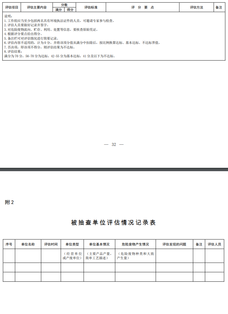 (二)地方評估。省級生態(tài)環(huán)境部門對市級生態(tài)環(huán)境部門的評估,可結(jié)合本省(區(qū)、市)實際,參照《評估指標》附表 1 執(zhí)行,具體指標可適當調(diào)整。各級地方生態(tài)環(huán)境部門按照《評估指標》附表 2、3 對產(chǎn)廢單位和經(jīng)營單位進行評估,并填寫《評估情況記錄表》(見附 2)。固體廢物管理、環(huán)境執(zhí)法、環(huán)境影響評價、排污許可等部門要對危險廢物規(guī)范化環(huán)境管理評估工作做好必要的政策指導。有條件的地區(qū),可以采取購買第三方服務等方式,為危險廢物規(guī)范化環(huán)境管理評估工作提供技術支撐。