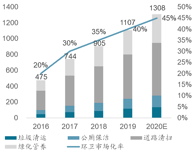 圖表1 2016-2020年全國環(huán)衛(wèi)市場化空間規(guī)模及市場化率測算