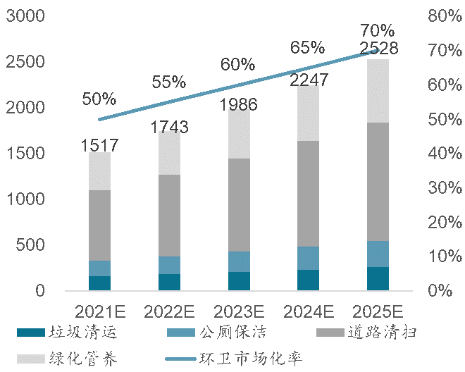 圖表3 2021-2025年全國環(huán)衛(wèi)市場化空間規(guī)模及市場化率預(yù)測