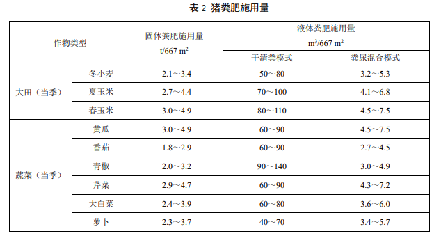 8.3 當以施用畜禽養(yǎng)殖糞肥作為作物養(yǎng)分唯一來源時,中等土壤肥力農田的豬糞肥施用量按照表 2 的規(guī)定執(zhí)行。當有條件進行土壤肥力測試時,施用量可按照不同土壤肥力水平進行適當調整。