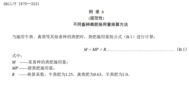 8.4 當施用不同畜種糞肥時,糞肥施用量應按照附錄 B 中公式 B.1 進行換算。