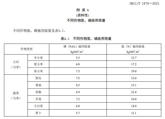 8.2 固體糞肥施用以磷為限量依據,氮素不足時補施氮肥;液體糞肥施用以氮為限量依據,磷素不足時補施磷肥。氮、磷施用限量見附錄 A。