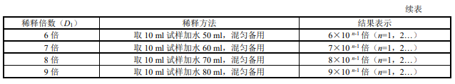 用量筒(6.6)取第 n−1 次初級(jí)稀釋的試料,按照表 1 的稀釋方法由小到大逐級(jí)按自然倍數(shù)進(jìn)行稀 釋,每稀釋 1 次,混勻后按目視比色方法(8.3)觀察,直到剛好與水(5)無(wú)法區(qū)別時(shí)停止稀釋,記錄稀釋倍數(shù) D1。
