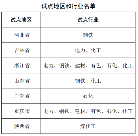 試點(diǎn)行業(yè)為電力、鋼鐵、建材、有色、石化和化工等重點(diǎn)行業(yè),試點(diǎn)地區(qū)根據(jù)各地實(shí)際選取試點(diǎn)行業(yè)和建設(shè)項(xiàng)目(詳細(xì)名單見附件1)。除上述重點(diǎn)行業(yè)外,試點(diǎn)地區(qū)還可根據(jù)本地碳排放源構(gòu)成特點(diǎn),結(jié)合地區(qū)碳達(dá)峰行動(dòng)方案和路徑安排,同步開展其他碳排放強(qiáng)度高的行業(yè)試點(diǎn)。