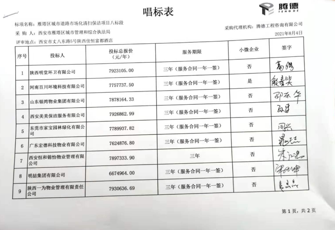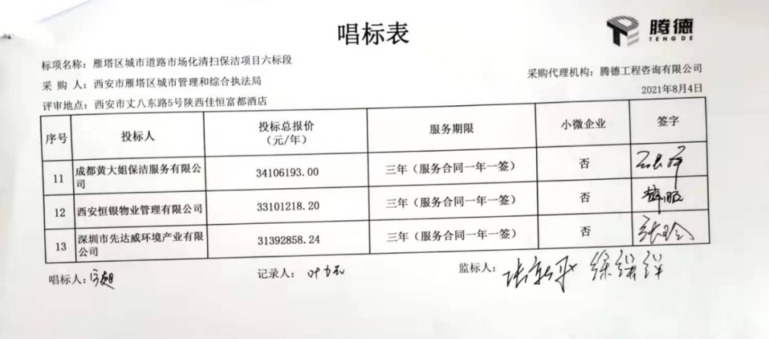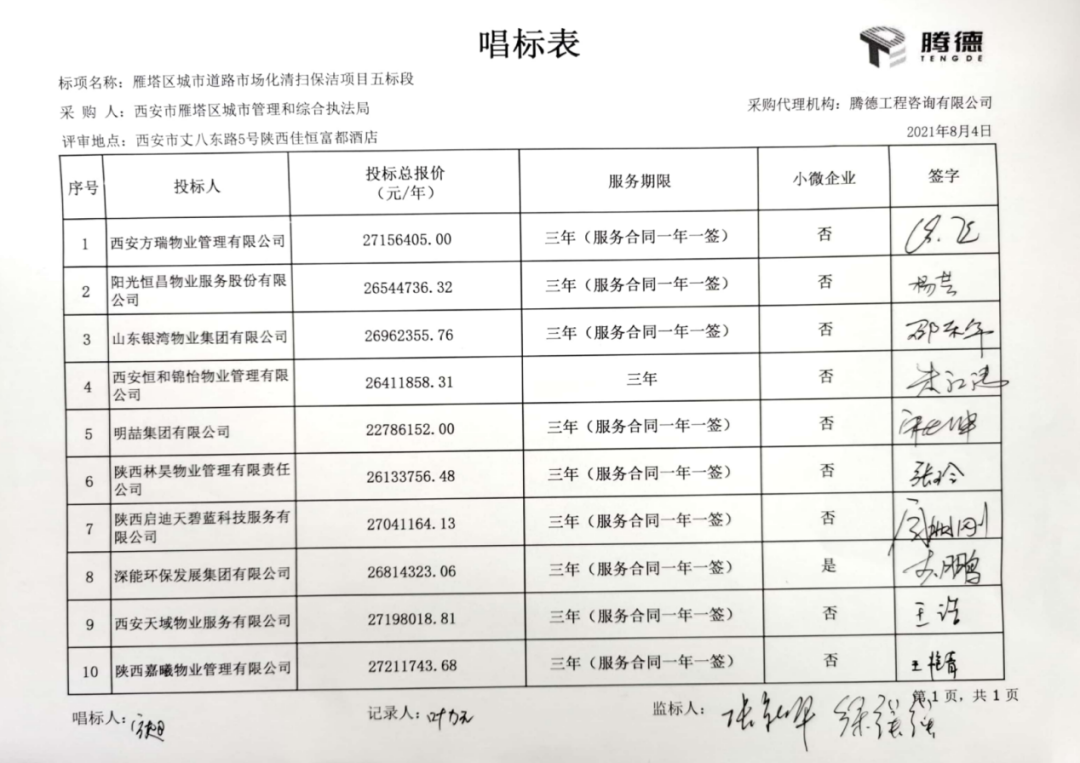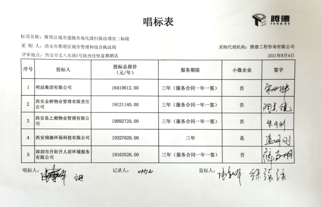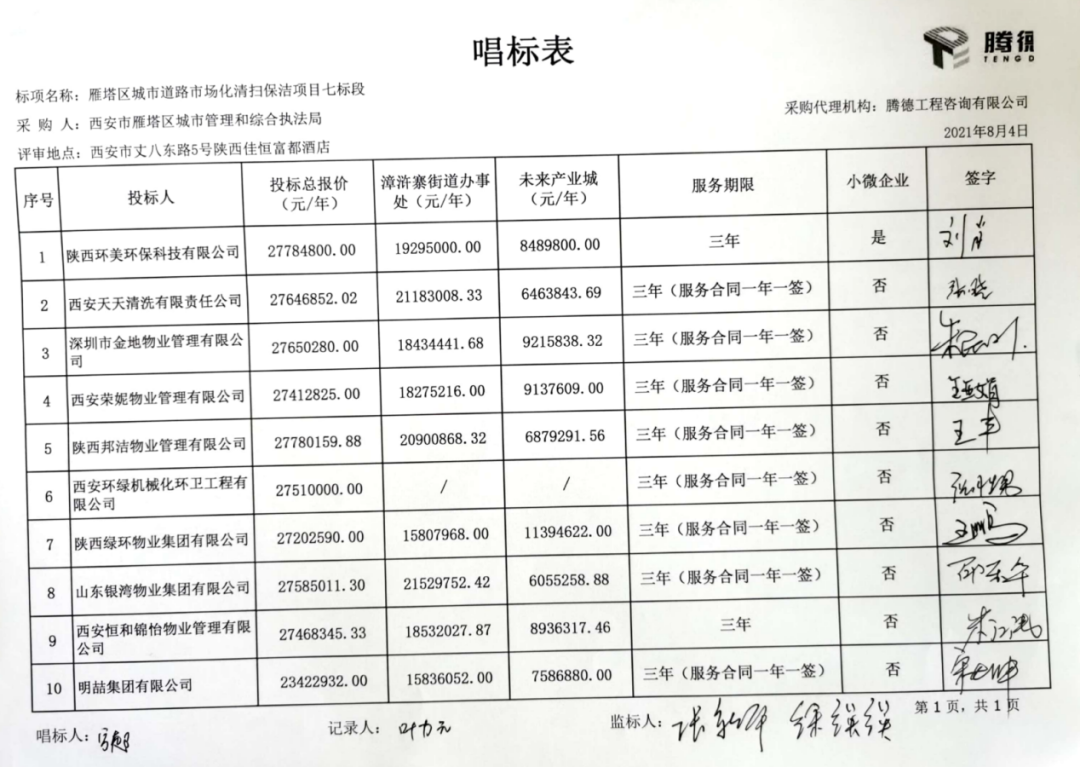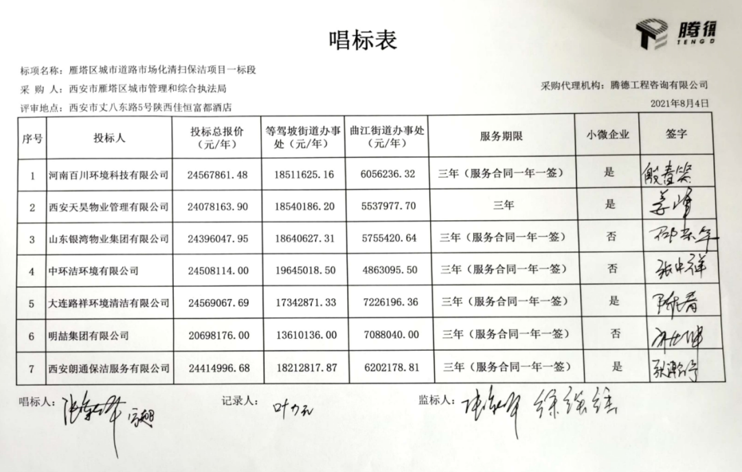 附:西安市雁塔區(qū)城市道路市場化清掃保潔項(xiàng)目開標(biāo)情況