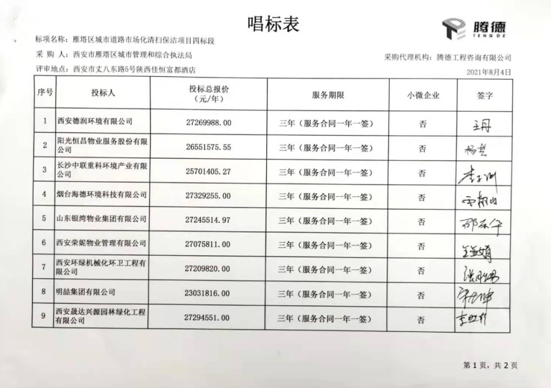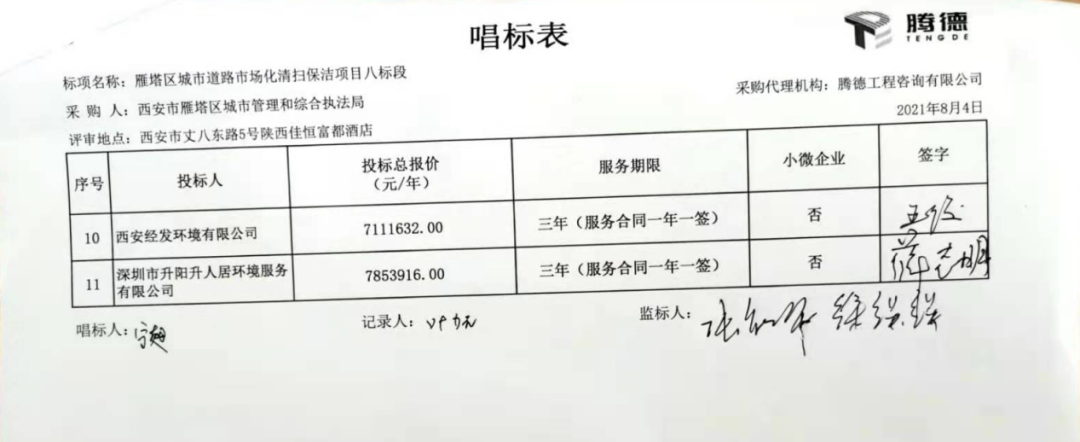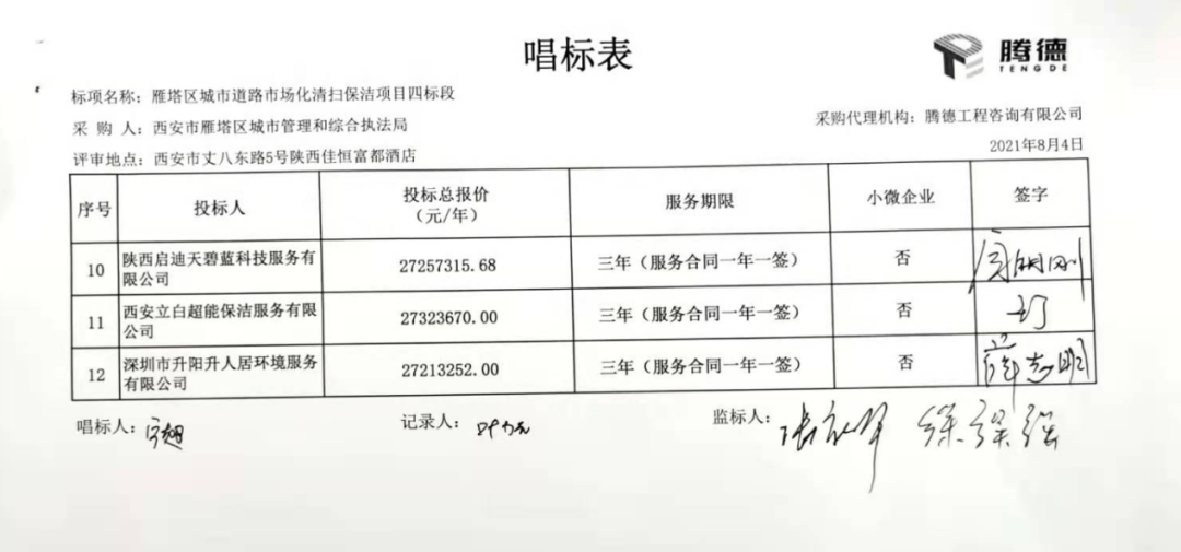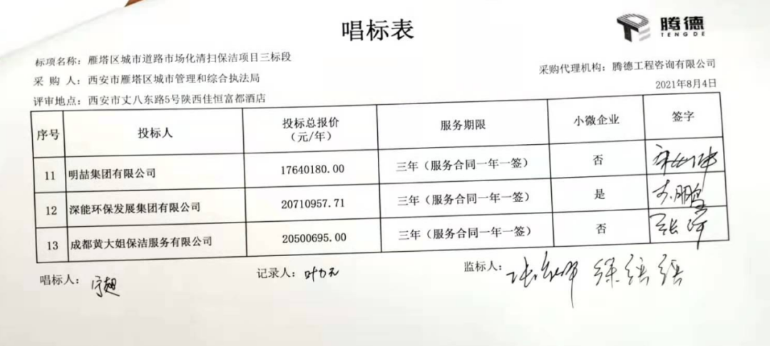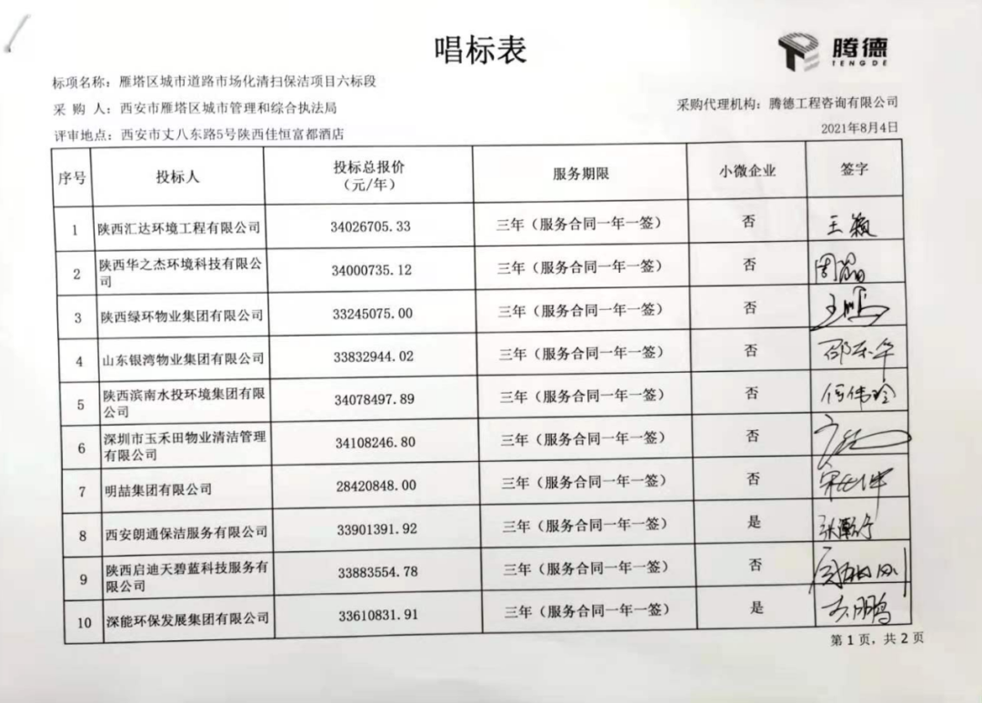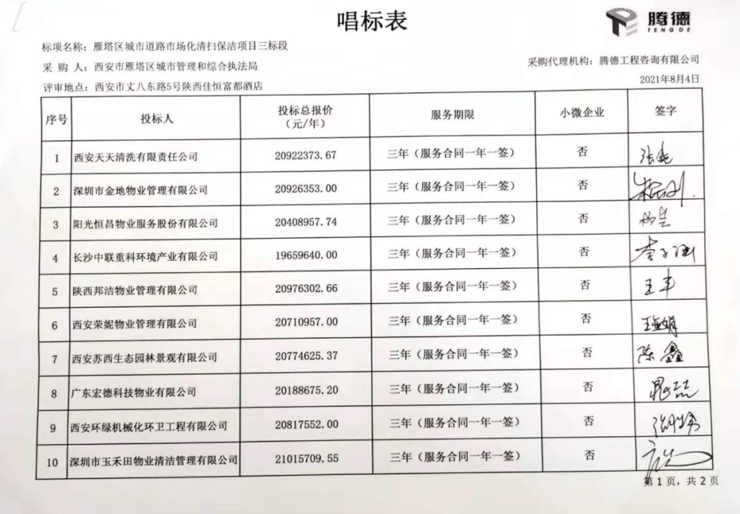 附:西安市雁塔區(qū)城市道路市場化清掃保潔項(xiàng)目開標(biāo)情況
