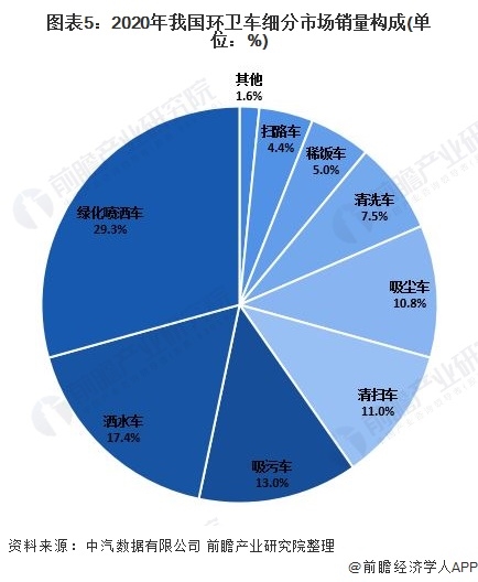 從各功能車輛種類來看,2020年綠化噴灑車、灑水車、吸污車、清掃車、吸塵車五類車型的比重總占比達(dá)到80%以上。其中,綠化噴灑車市場占比高達(dá)30%,銷量為20068輛,同比增長19.1%。