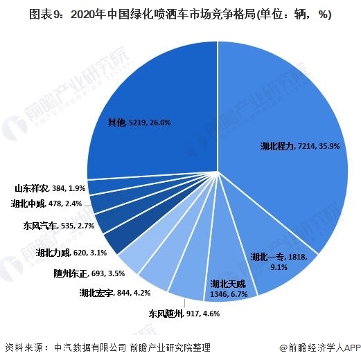 在綠化噴灑車市場中,銷量TOP10企業(yè)集中度為74%,較2019年同期下滑了7.5個(gè)百分點(diǎn)。其中湖北程力專用汽車有限公司銷量達(dá)到7214輛,市場份額占比為35.9%,在綠化噴灑車市場中占據(jù)了絕對優(yōu)勢。
