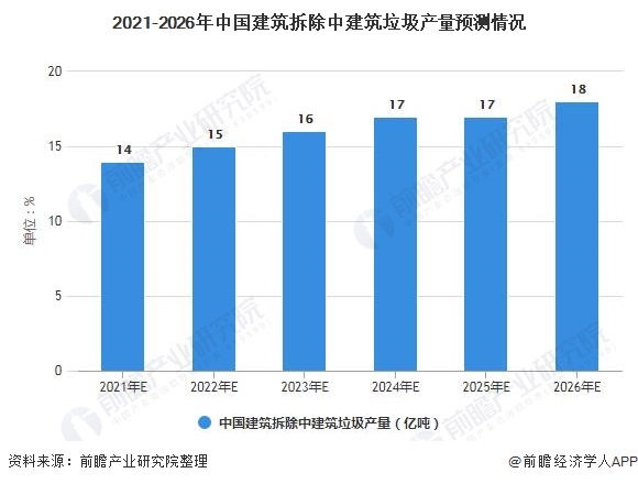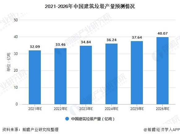 前瞻根據(jù)初步預(yù)測到2021年我國需要處理的建筑垃圾產(chǎn)量將達(dá)到32.09億噸,2026年,產(chǎn)量有望突破40億噸;若以35元/噸(運(yùn)輸費(fèi)與處置費(fèi))計算,預(yù)計2021年建筑垃圾處理市場規(guī)模將超過1400億元。