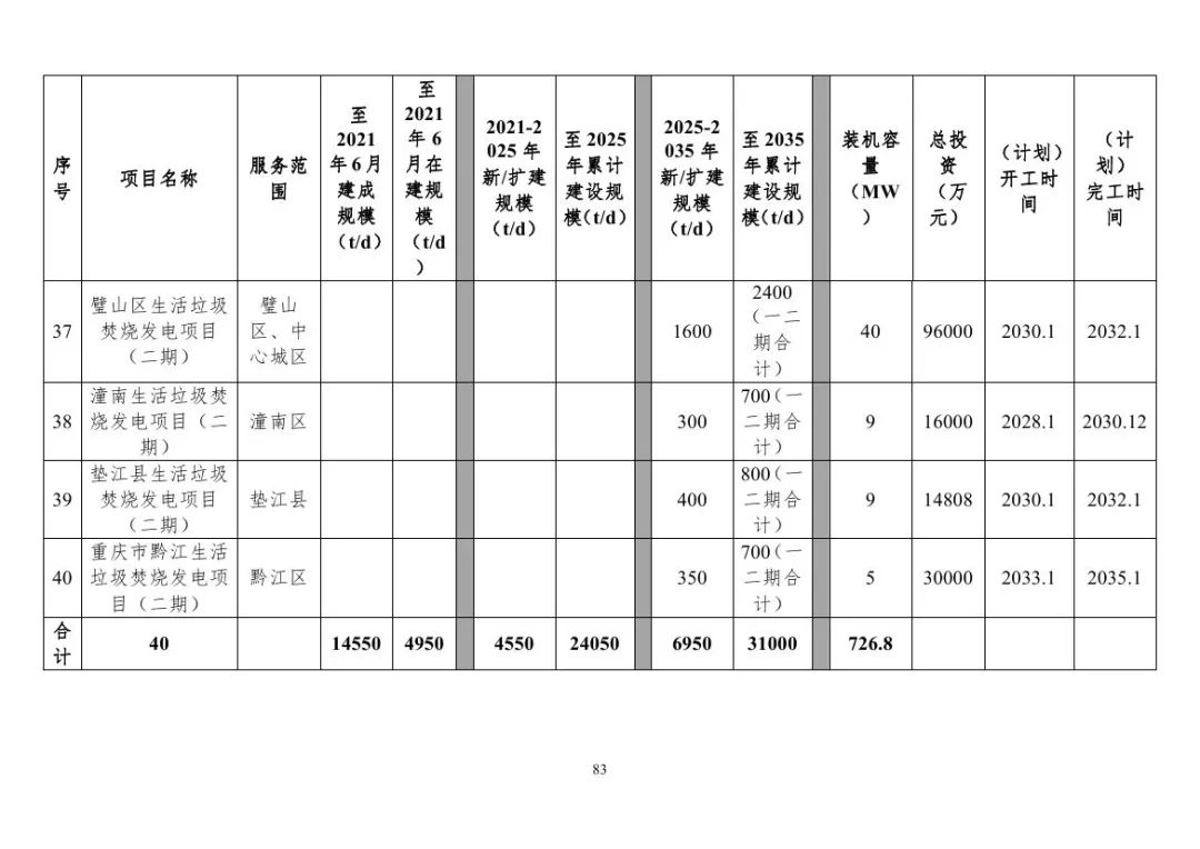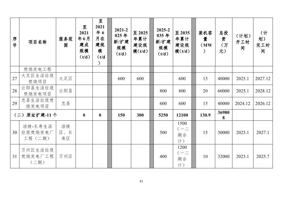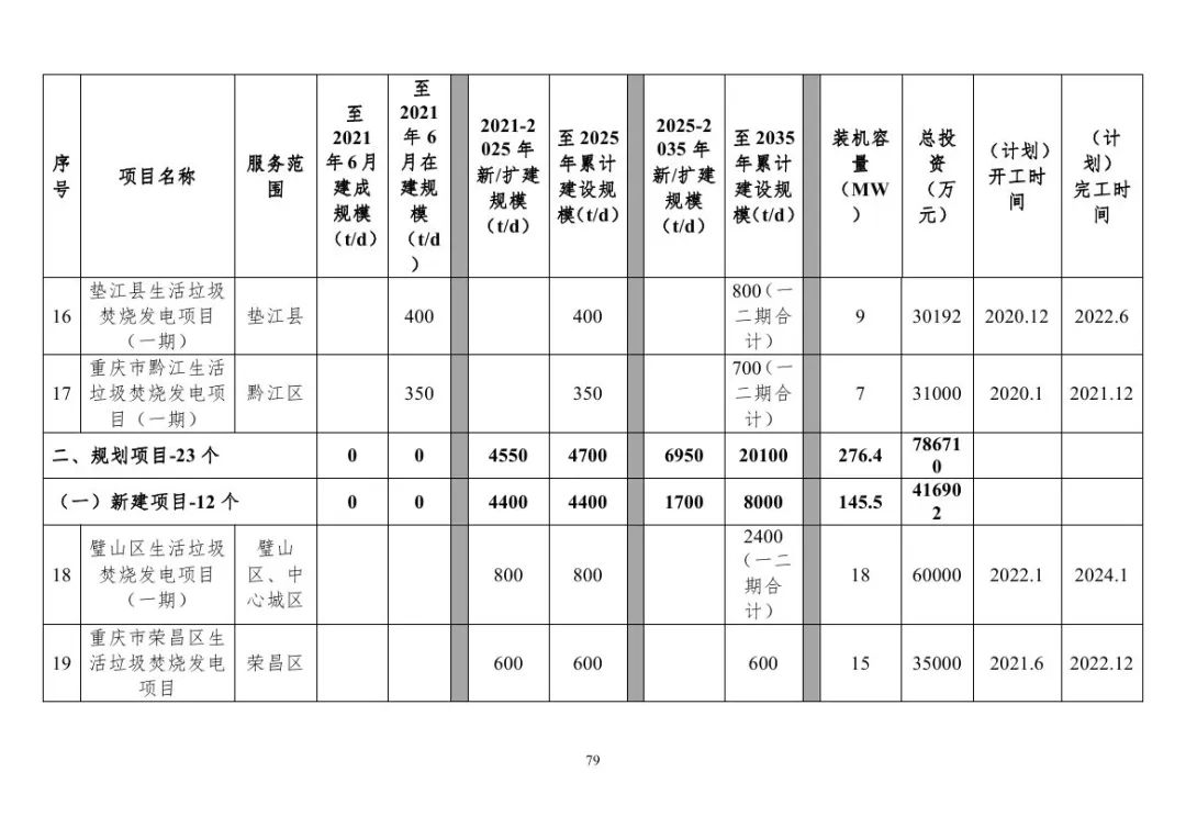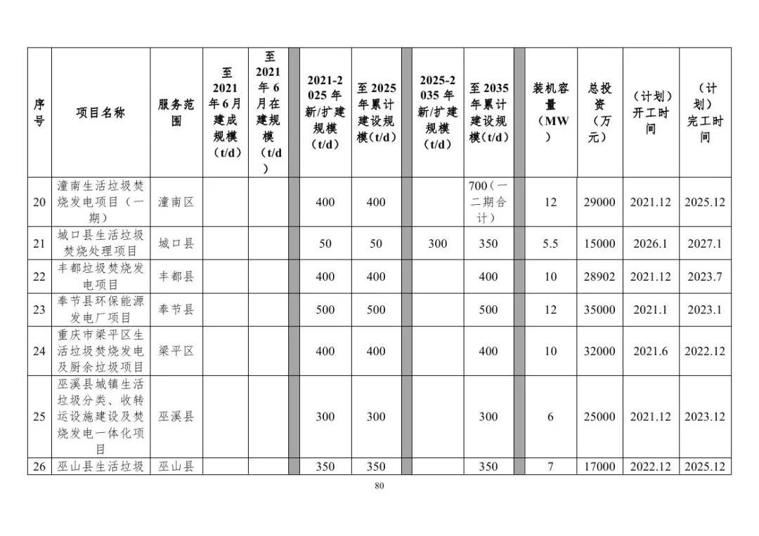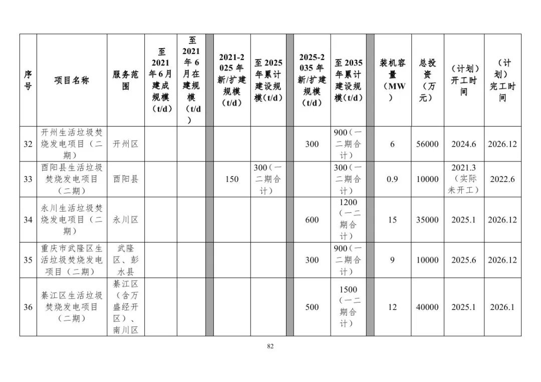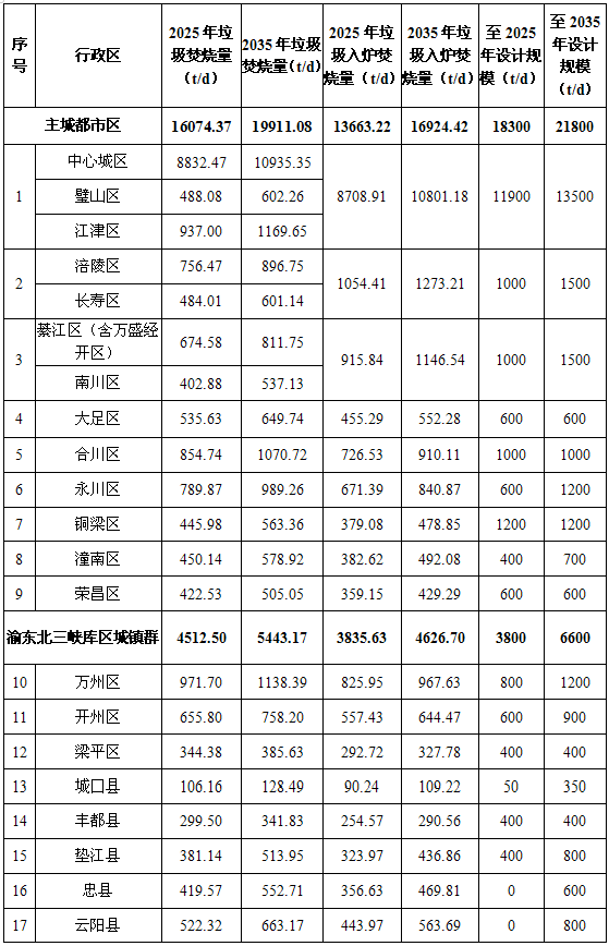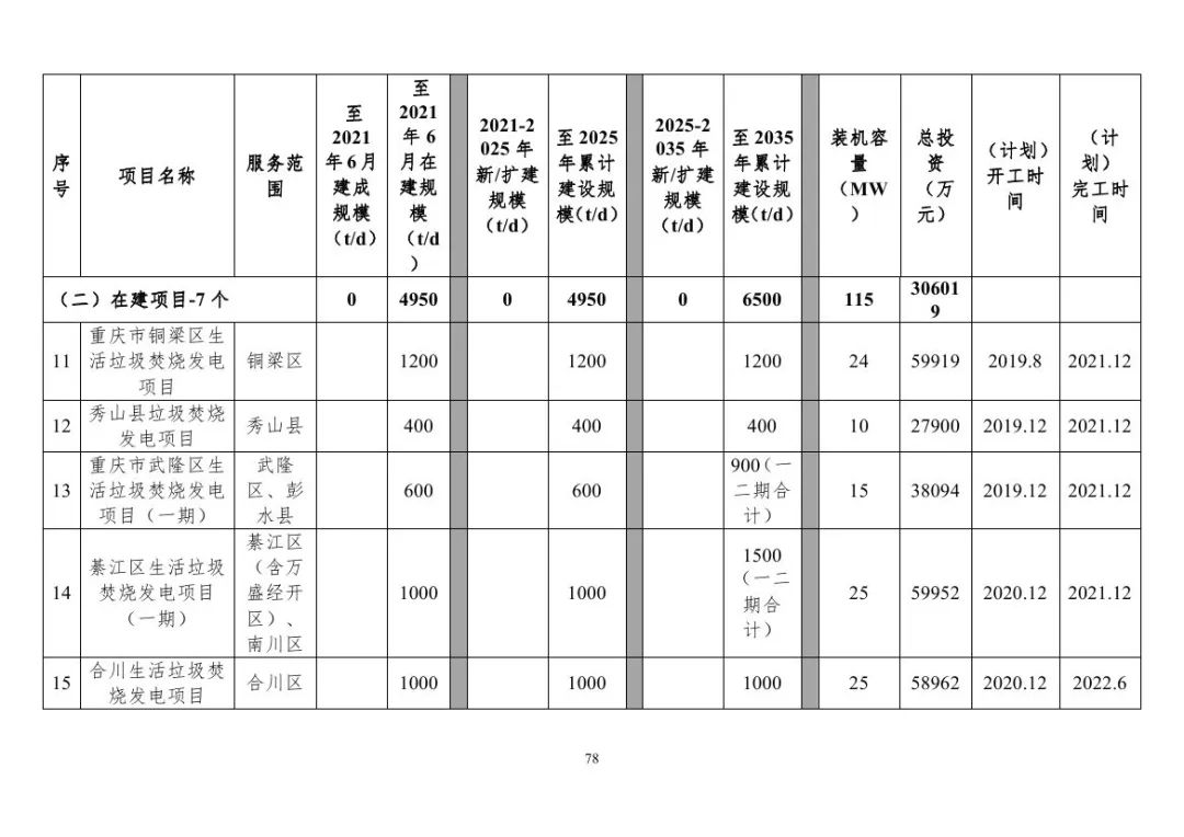重慶市生活垃圾焚燒發(fā)電項(xiàng)目建設(shè)情況表