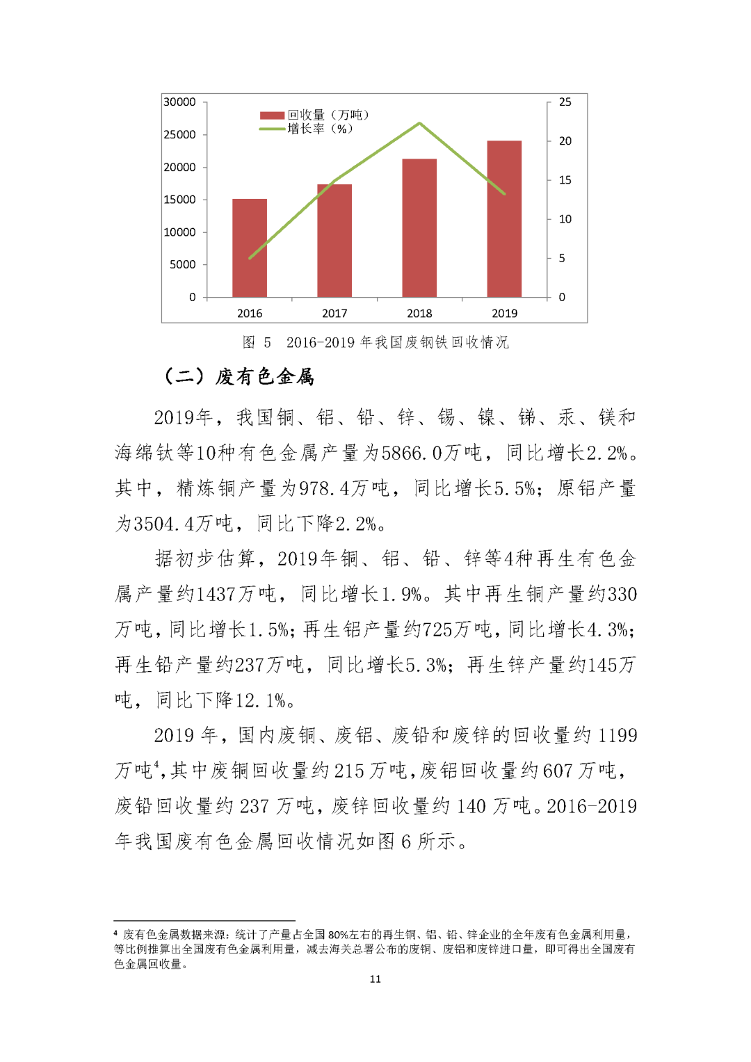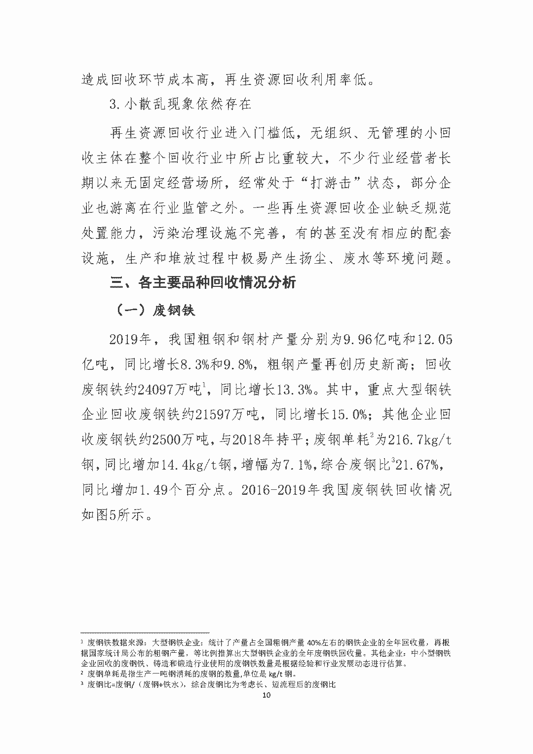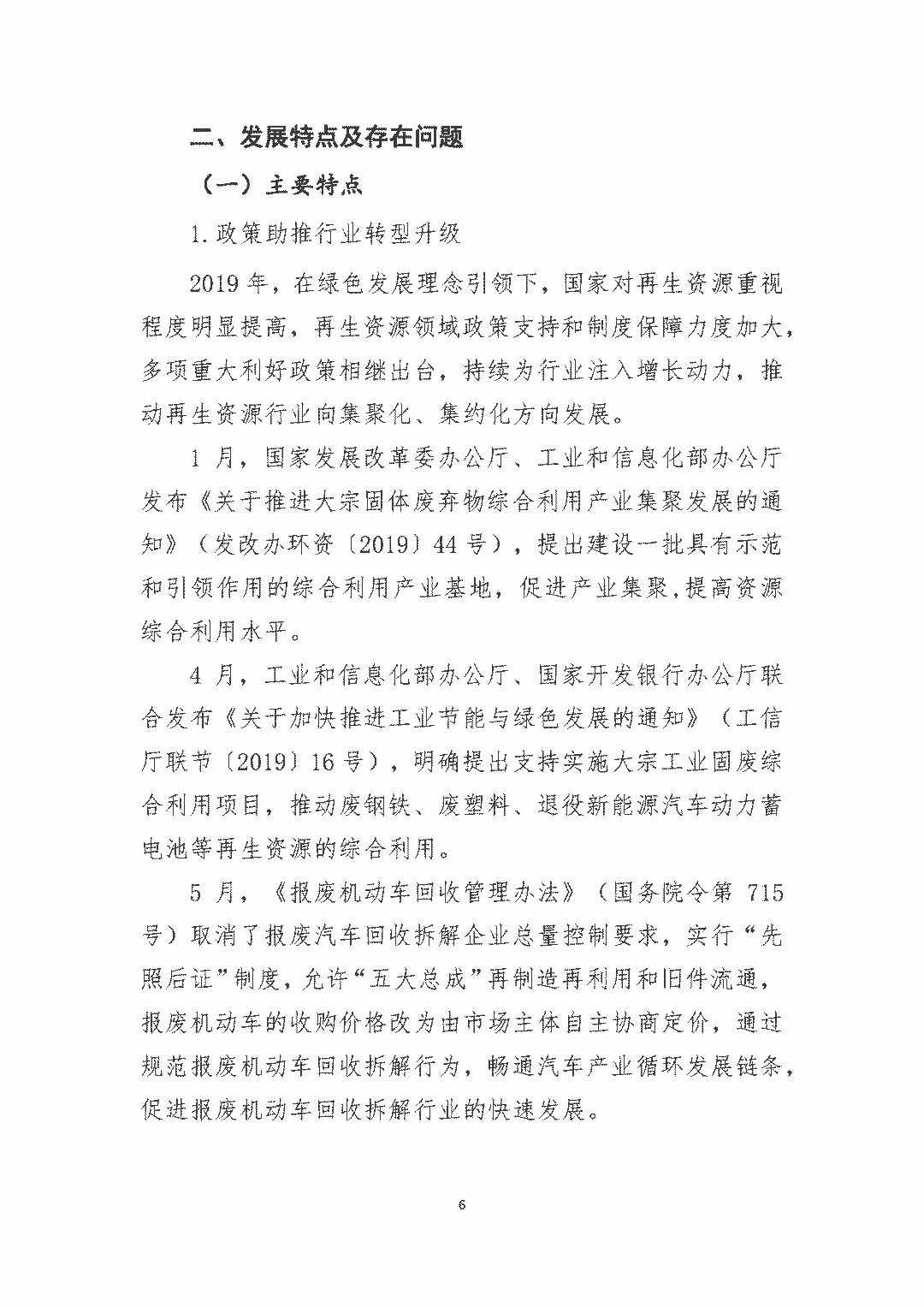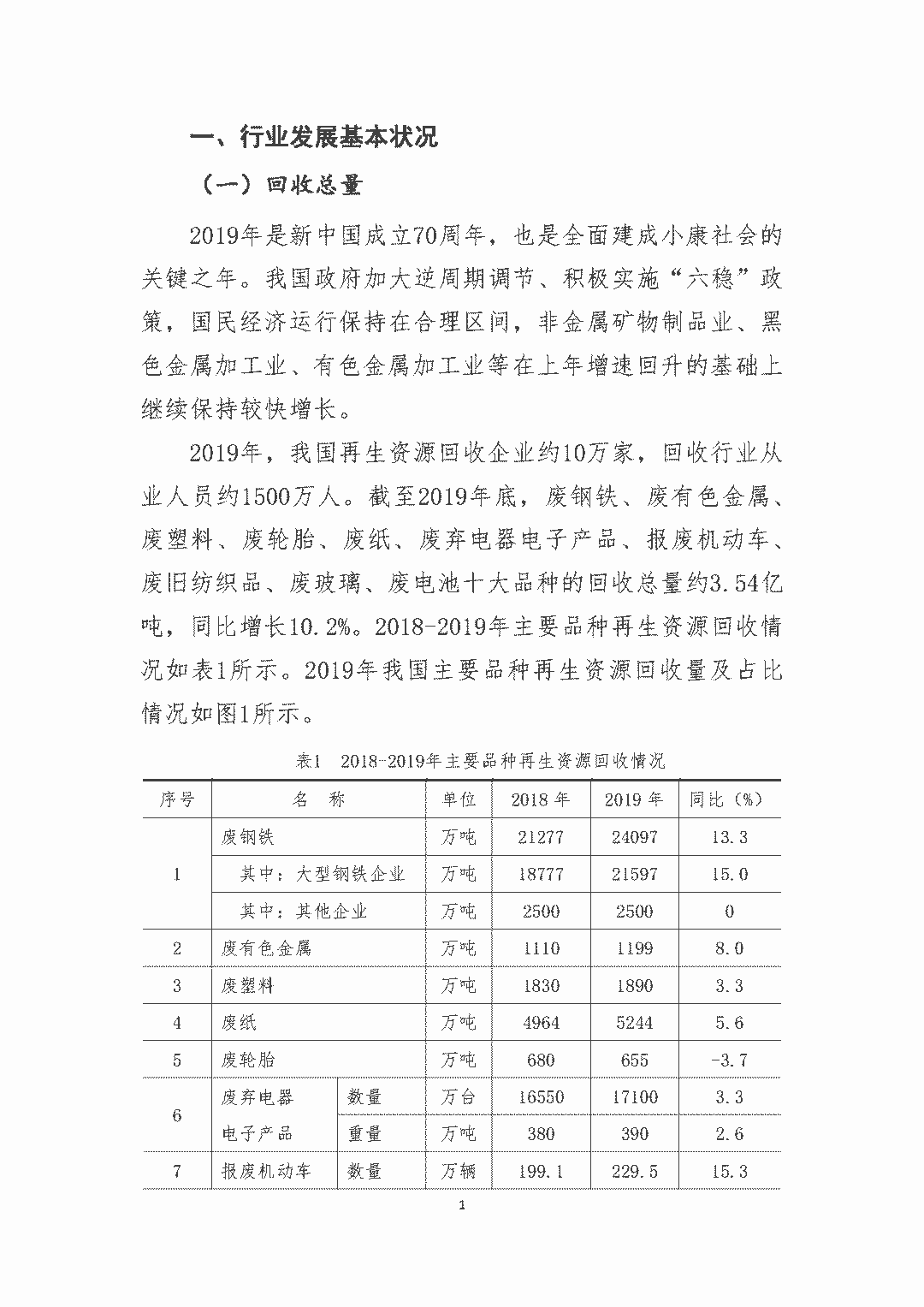 在綠色發(fā)展理念引領下,我國再生資源回收行業(yè)進一步發(fā)展壯大,再生資源回收體系不斷完善,行業(yè)創(chuàng)新升級步伐不斷加快;十大品種再生資源回收總量和回收總額取得新突破,行業(yè)規(guī)模和發(fā)展質(zhì)量進一步提升;深刻影響再生資源回收行業(yè)的多項重大利好政策相繼出臺,我國再生資源回收產(chǎn)業(yè)迎來了新的發(fā)展契機。為全面系統(tǒng)地反映2019年再生資源回收行業(yè)的基本情況,更好地服務企業(yè)和社會公眾,商務部流通業(yè)發(fā)展司整合各方資源,組織編寫發(fā)布《中國再生資源回收行業(yè)發(fā)展報告(2020)》。